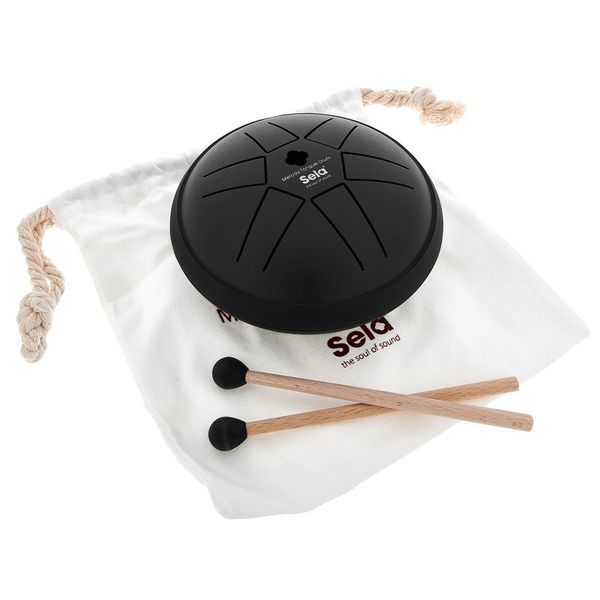So that you can start right after unpacking, each Sela Melody Tongue Drum comes with two high-quality processed mallets with birch wood handle and round rubber head. The tone fields can also be struck with the fingers. The meditative sound of the Sela Melody Tongue Drum enchants players and listeners alike. On top of that, thanks to its compact size, it finds a chic place anywhere - whether at home, in the office, in the yoga studio or even on the road in your luggage. For safe transport, a practical cotton bag is included, which is lined with red velvet on the inside. Rubber feet ensure a secure stand, and a rubber ring protects the outer edge of the Sela Melody Tongue Drum from scratches.