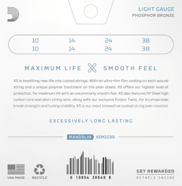 - Родени от нашия най-голям пробив в иновациите при струните, струните XS Phosphor Bronze имат най-дълъг живот от всички струни за мандолина D’Addario. Покритието XS осигурява на нашите топли, балансирани струни от фосфорен бронз максимален живот, с необичайно гладко усещане. Изработени с сърцевина от NY Steel, обвита тел от фосфорен бронз и технология Fusion Twist, струните за мандолина с покритие XS имат несравнима якост на скъсване и стабилност на настройката, в допълнение към драстично увеличения си живот. Струните с дебелина 10-38 Light осигуряват добър баланс между свирене и резонанс.