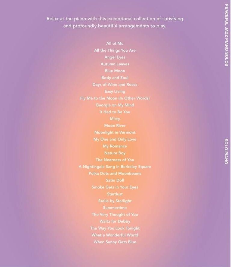 Relax at the piano with this exceptional collection of satisfying and profoundly beautiful arrangements of 30 standards: All of Me · All the Things You Are · Angel Eyes · Body and Soul · Days of Wine and Roses · Fly Me to the Moon (In Other Words) · Georgia on My Mind · It Had to Be You · Misty · Moon River · My Romance · Nature Boy · Polka Dots and Moonbeams · Satin Doll · Smoke Gets in Your Eyes · Stella by Starlight · Summertime · The Very Thought of You · Waltz for Debby · The Way You Look Tonight · What a Wonderful World · and more.