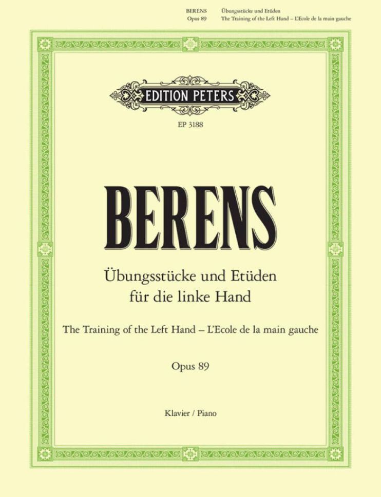 The Training of the Left Hand by Berens (Op. 89), edited by Adolf Ruthardt. These exercises are intended to impart velocity, strength and a uniform touch to the fingers. Those who have the patience to take up 6 to 8 numbers a day and to practice them for 10 to 15 minutes will soon be convinced of the utility of the same.